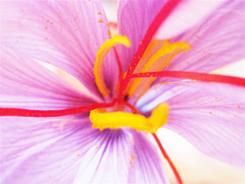 on se retrouve autour de la table, les fleurs déposées en tas, c'est parti pour ce travail minutieux. On cause, on boit du thé safrané, on découvre le parfum délicat du safran frais pendant que nous émondons.
